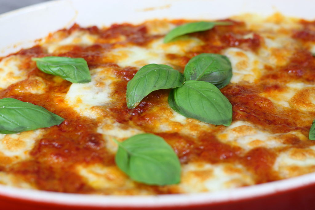 - Haal uit de oven en garneer met verse basilicumblaadjes. Serveer direct. Buon appetito!